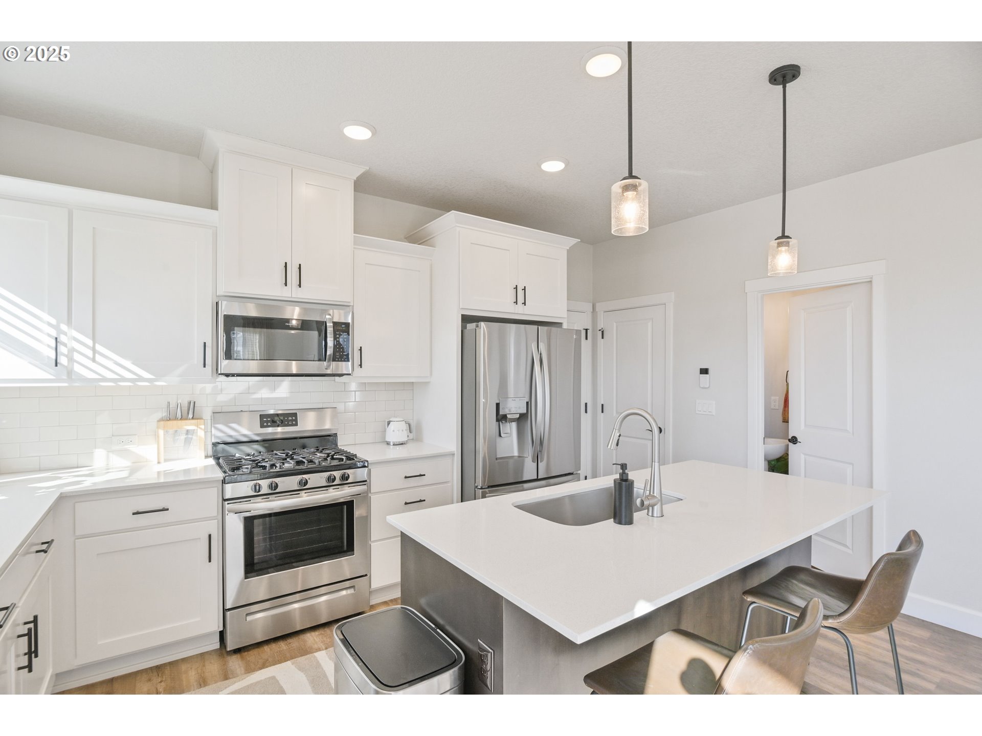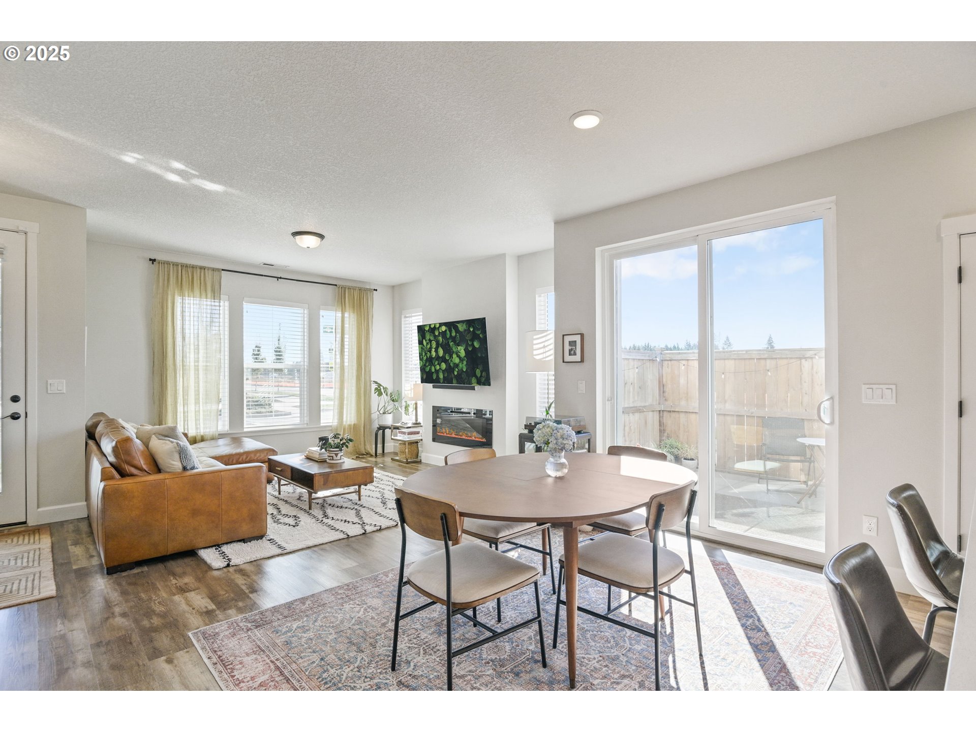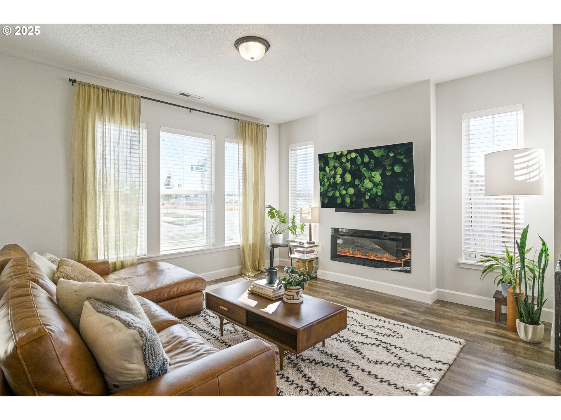 - This rare duplex-style townhome sits on a sunny corner lot facing Mt. Hood. Natural light floods the rooms creating a cheerful ambiance and enhancing the stylish finishes. The beautiful designer kitchen is both luxurious as well as practical with lots of storage and counter space, enhanced by quartz, tile, pendant lights, and soft-close hardware. Luxury vinyl flooring covers the entire main floor. The living room area is upgraded with an electric fireplace adding warmth and comfort.Upstairs you will find a spacious primary suite with abundant window light, tray ceilings, and even a view of Mt Hood at one end. The primary bath has twin sinks, a walk-in closet and private WC. Outside, the rare, extra-wide side yard is fully fenced for privacy plus upgraded with an extended patio and low maintenance turf. The 2-car garage opens to a rare private driveway, providing additional outdoor space for cars or weekend projects.This home is special! David Weekley built in 2021, it shows like new and offers blinds, AC, all appliances and a prime location. Enjoy the vibrant and friendly Reeds Crossing neighborhood with walking trails, parks, elementary school, shopping, coffee and restaurants all within. [Home Energy Score = 10. HES Report at https://rpt.greenbuildingregistry.com/hes/OR10197712]