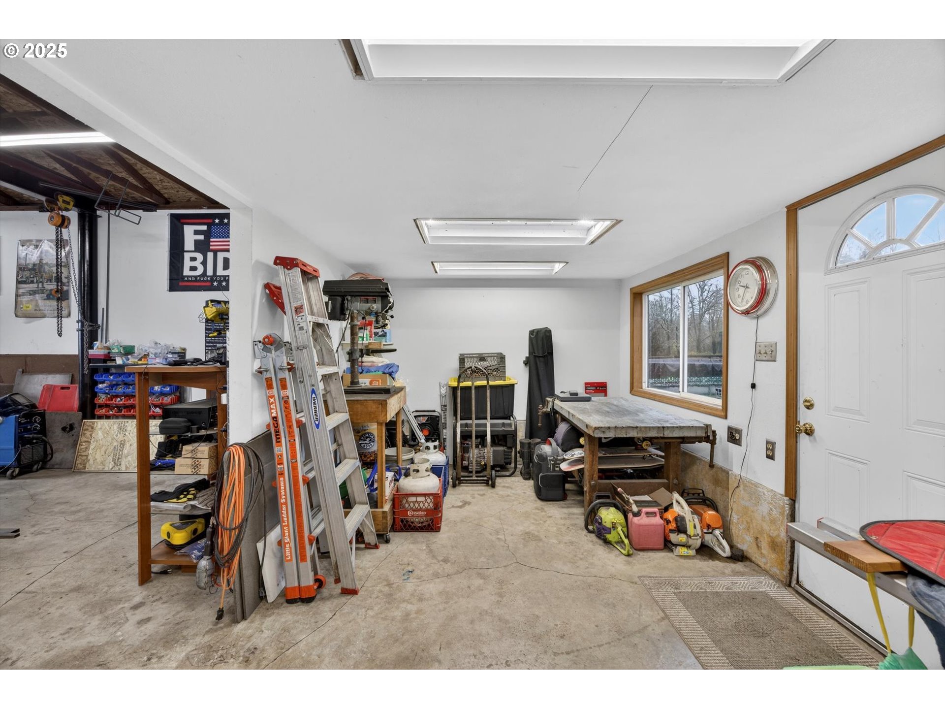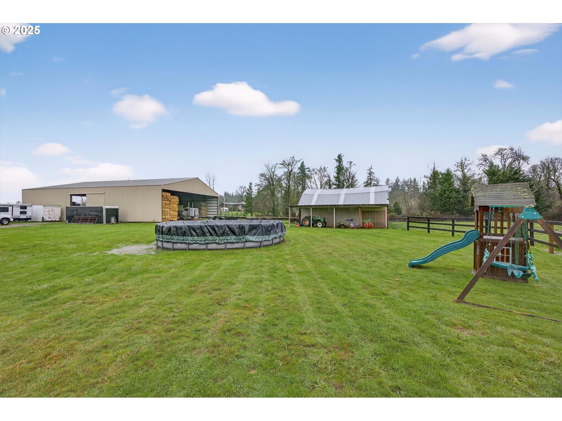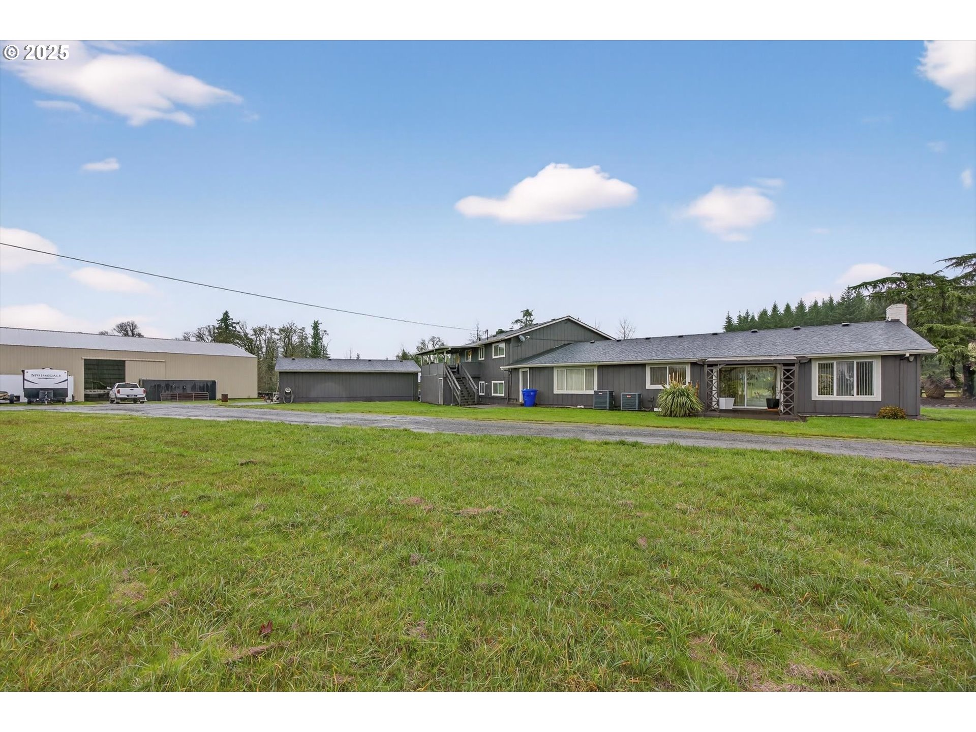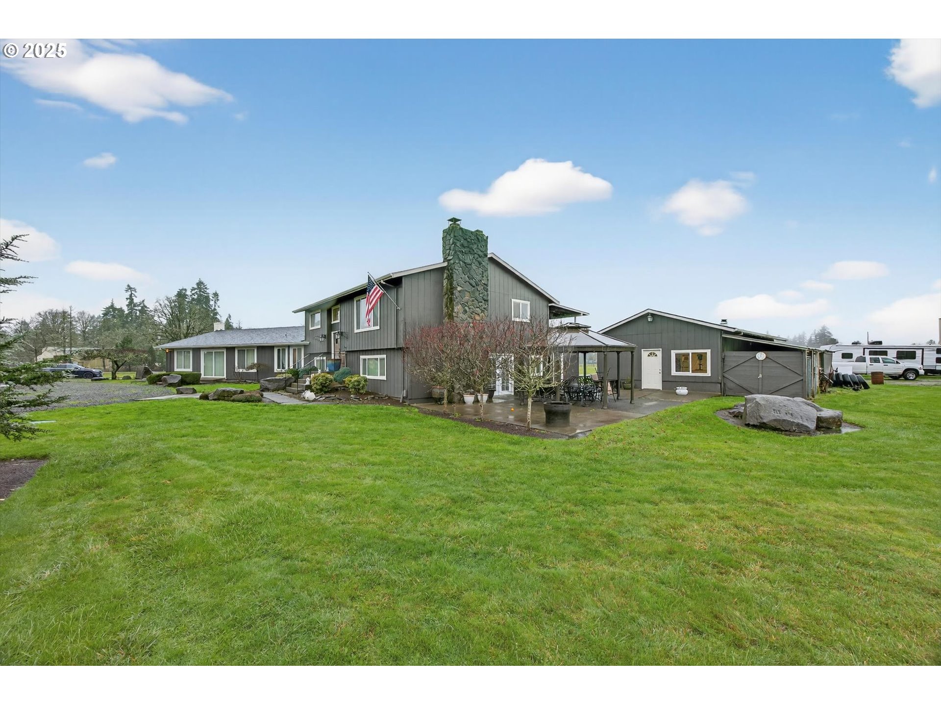 - Discover this stunning 5.34-acre hilltop estate in Molalla, Oregon, offering breathtaking sunrise and sunset views and a perfect blend of comfort, space, and versatility. A private gated driveway opens to a wide turnaround with ample parking, making it ideal for residential living, entertaining, or multi-generational households. The main entrance leads to a landing with stairs accessing either the upper level or the spacious main floor, creating a flexible and inviting layout for modern living. The main floor includes four bedrooms—each with its own closet—plus a den and multiple exterior entrances, providing functional and accessible spaces. A soaring great room and a generous bonus room offer comfortable areas for living, recreation, or relaxation. Upstairs, the bright living room opens to a kitchen/dining combo with sliding doors onto a covered deck, perfect for outdoor entertaining and enjoying the hilltop views. The primary suite features a walk-in closet, creating a relaxing retreat within the open, airy layout. Recent updates include a new roof, new septic and drain field system, new water softener systems, a whole-home central vacuum system, exterior paint, and two heat pumps—ensuring modern comfort and peace of mind. Outdoors, enjoy a beautiful patio for entertaining, expansive well-kept lawn areas, and substantial outbuildings, including a well-equipped shop with workshop space, a versatile barn, and a large covered structure for storage. While ideal as a private residential estate, this Molalla acreage property also offers flexibility for a small residential care home or other multi-family arrangements.