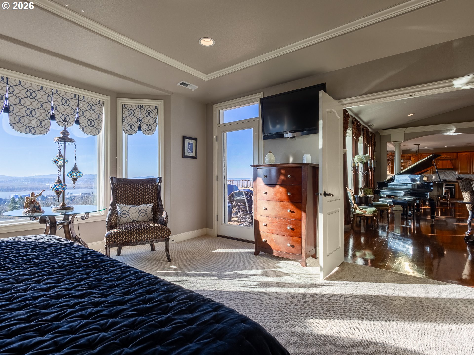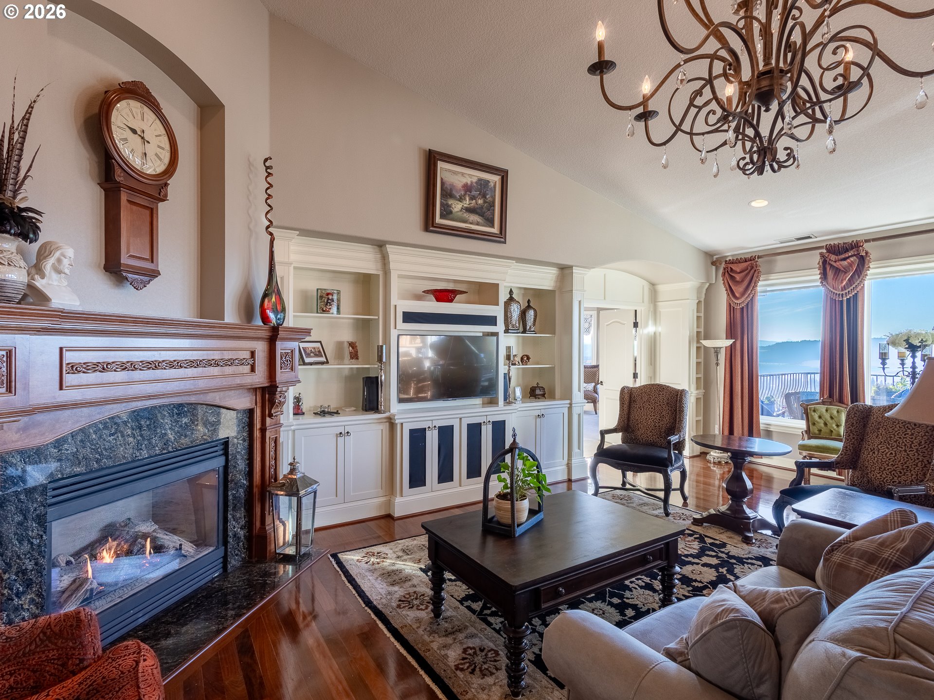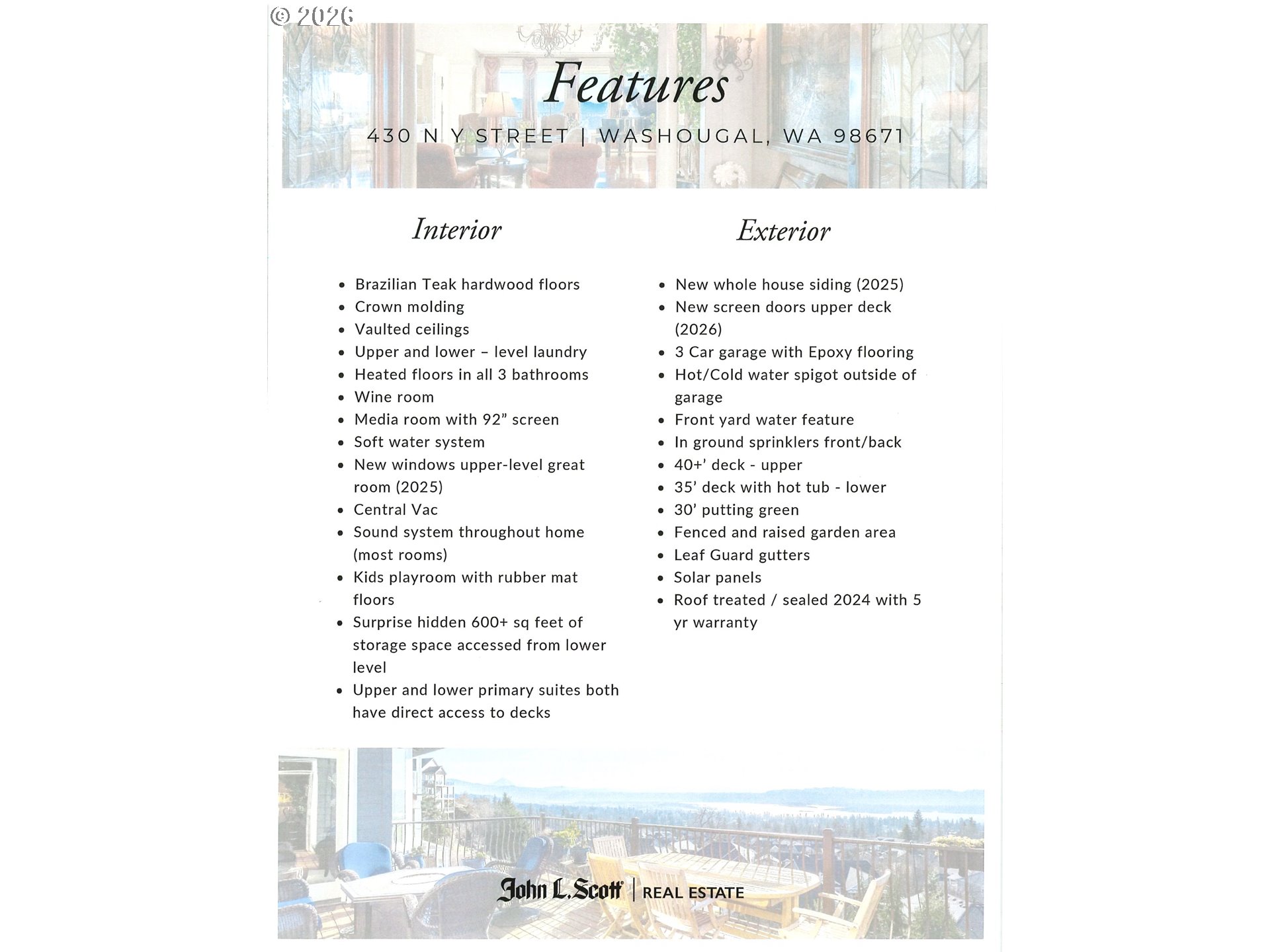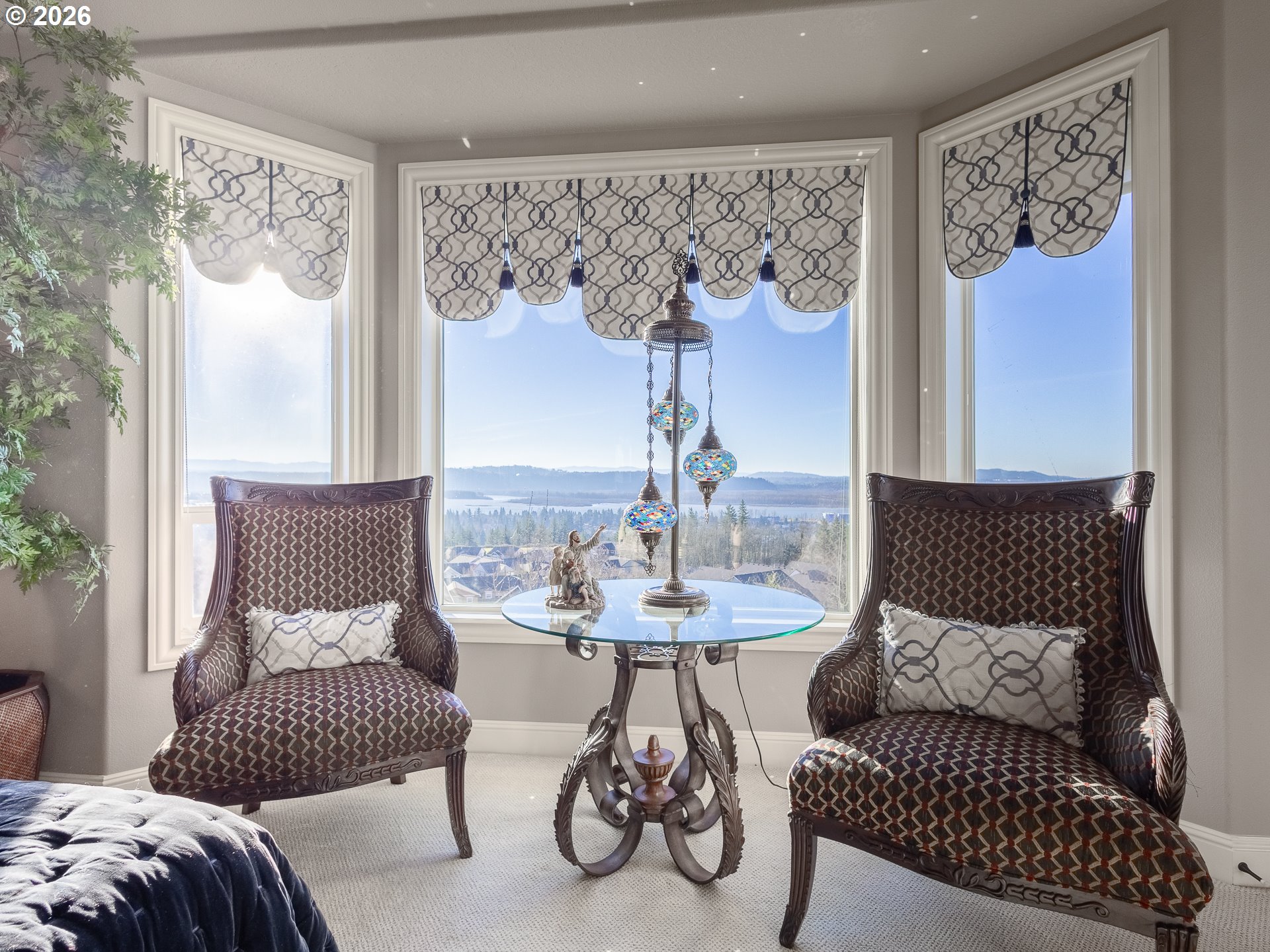 - Breathtaking panoramic views of the Columbia River, Mt. Hood, and the Portland cityscape set the stage for this exceptional 2004 Parade of Homes residence. Offering 4,700+ sq ft, this 4-bedroom, 3-bath home blends luxury, comfort, and thoughtful design.The main level features 2,475 sq ft of single-level, open-concept living with a spacious great room, gourmet kitchen, and a professional office. Brazilian Teak Hardwood floors, south facing picture windows with river views and a gas fireplace make this level a cozy retreat. Also on the main floor are a beautifully refinished full bath with heated floors, a second bedroom, and a laundry room with sink and ample storage. The primary suite is a true retreat, showcasing a bay window with seating area and direct access to the 40+ foot upper level deck. The ensuite bath includes a jetted soaking tub, 8-ft walk-in shower, double vanities, heated floors, and a walk-in closet.The finished lower level offers an additional 2,230 sq ft, including a second primary bedroom with access to the 35' lower deck and hot tub. This level also features a gaming area with wet bar, theater room, wine room, kids’ playroom, fourth bedroom, updated third bath with heated floors, and a second laundry/craft room, plus access to 600+ sq ft of storage. Outdoor living is equally impressive with mature landscaping, a putting green, and a fenced raised garden area. The 3-car garage features epoxy flooring and a exterior hot- and cold-water spigot for car washing. Brand-new siding (2025) wraps the entire home.Appliances staying with home. With too many features to capture here, this home truly must be seen in person. See the Features Sheet for additional details.OPEN HOUSE Sat 1/31 11am - 1pm and Sun 2/1 12pm - 2pm.