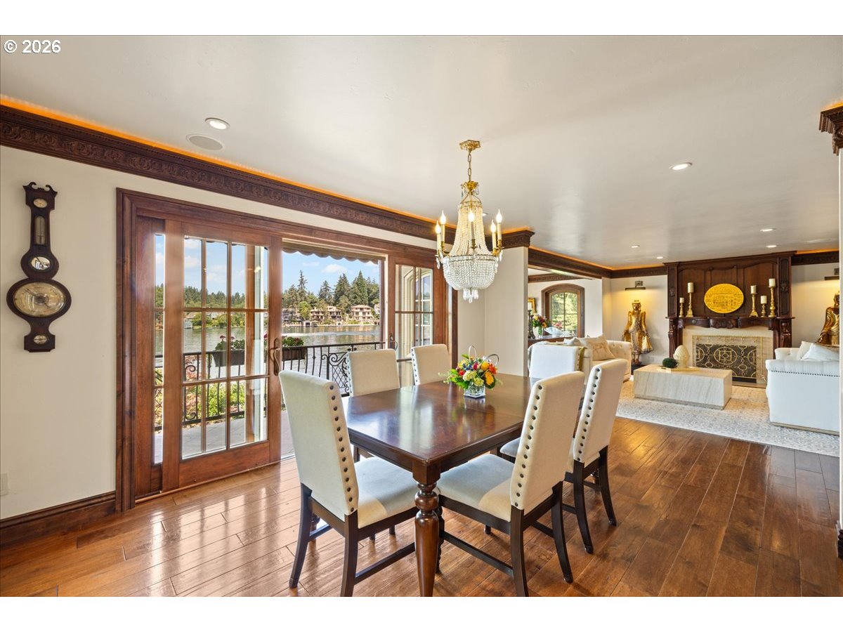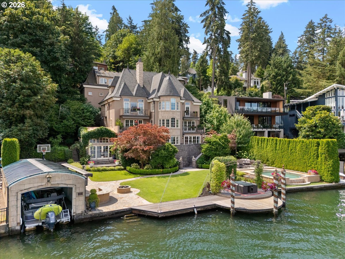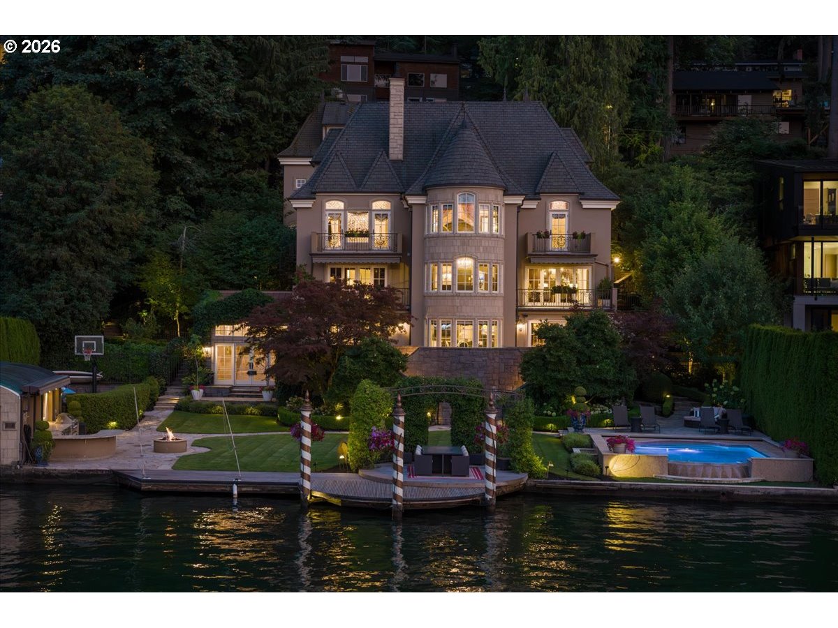 - Welcome to an extraordinary waterfront retreat on Oswego Lake—where European-inspired charm, modern luxury, and effortless lakefront living come together in perfect harmony. Tucked behind an incredibly private entrance, this remarkable estate feels like a hidden French villa, offering serenity, style, and timeless elegance from the moment you arrive. Warm and inviting areas flow into a cinematic courtyard with European flair—ideal for alfresco dinners, lively gatherings, or peaceful moments of escape.Outdoors, one of the best settings on the main lake awaits. Life unfolds across a rare, level double lot along the water’s edge. Enjoy a travertine sport court, lakeside outdoor kitchen, boat house, fire-pit, pool, and expansive entertaining spaces—your own private lakeside oasis. The home offers a gourmet chef’s kitchen opening to a grand great room and formal dining space, a refine library, beautifully appointed ensuite guest rooms, and a stunning Owner’s Suite with soaring vaulted ceilings. Most of the rooms offer extraordinary lake views. Designed for both fun and relaxation, you’ll also find a bonus recreational room with a soundproof music studio, a lower-level family room with a full bar, a 600-bottle wine cellar, a gym, and a serene indoor/outdoor spa.Two separate ADU/apartments within a detached garage provide wonderful flexibility for hosting guests, extended family, or staff. Elevator access connects the garage and apartment directly to the main home, with a second elevator serving three levels inside for effortless living throughout.Every detail of this estate reflects incredible quality, detail and thoughtful design, including a full earthquake retrofit completed during a comprehensive renovation in 2008. This is more than a home—it’s a lifestyle, a retreat, and a legacy property. One of Oswego Lake’s most unique and unforgettable residences.Resort Living on Lake Oswego’s Fabulous Waterfront and a Fantastic Price!