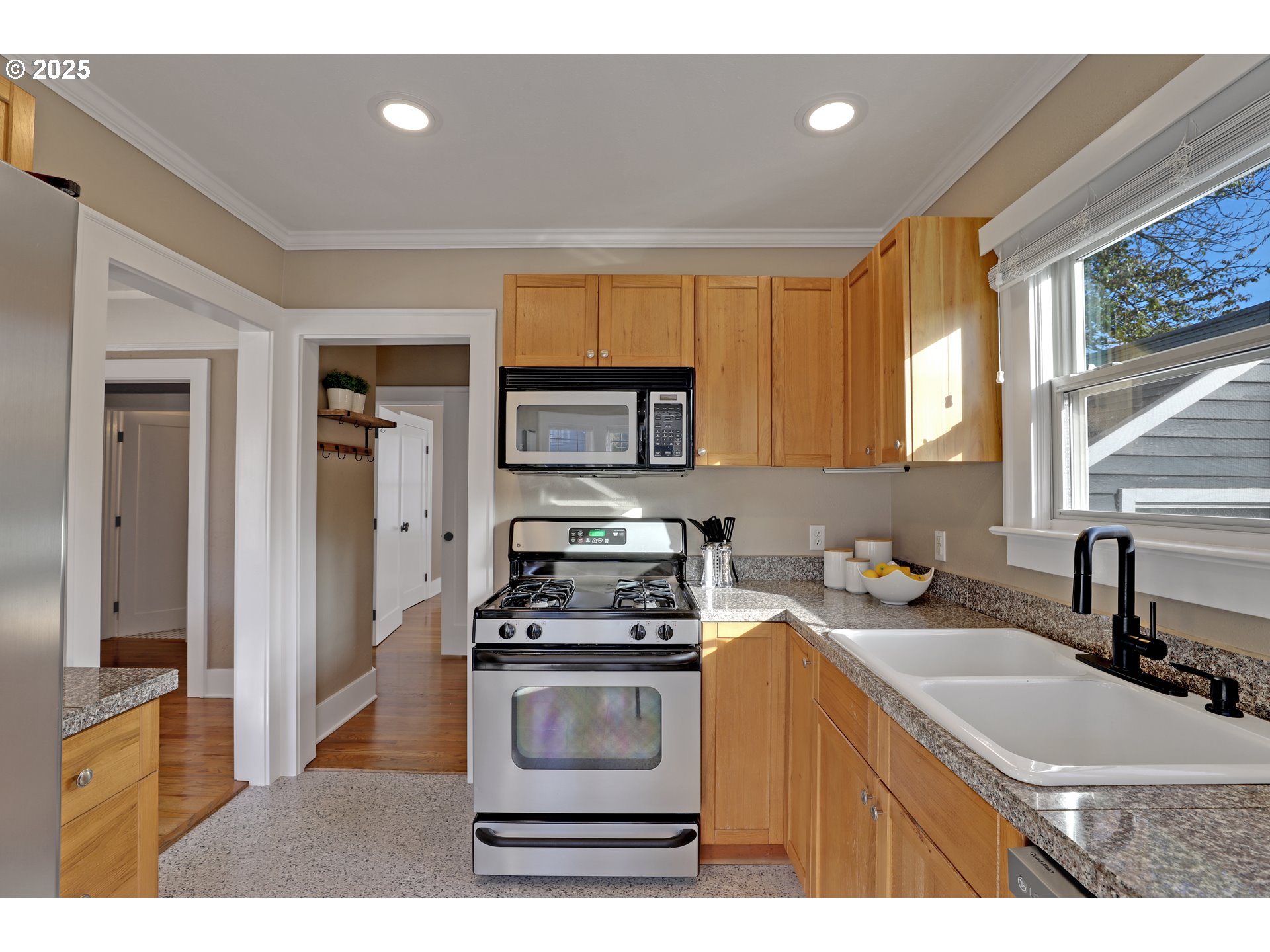 - Cute and tidy English perched above the street on a corner lot. South facing windows fill the living room, dining room and kitchen with ample natural light. A well ordered kitchen features a dining area in a bay windowed nook. Upstairs the primary suite includes hardwood floors, a crisp tiled bath, closet with organizer and plenty of space for a desk or cozy chair. This home is a practical blend of period details like built-ins, light fixtures and hardwood floors along with modern ones including updated plumbing and electrical. A petite partially fenced yard and detached single car garage round out this move-in ready neat as a pin home. [Home Energy Score = 4. HES Report at https://rpt.greenbuildingregistry.com/hes/OR10242503]