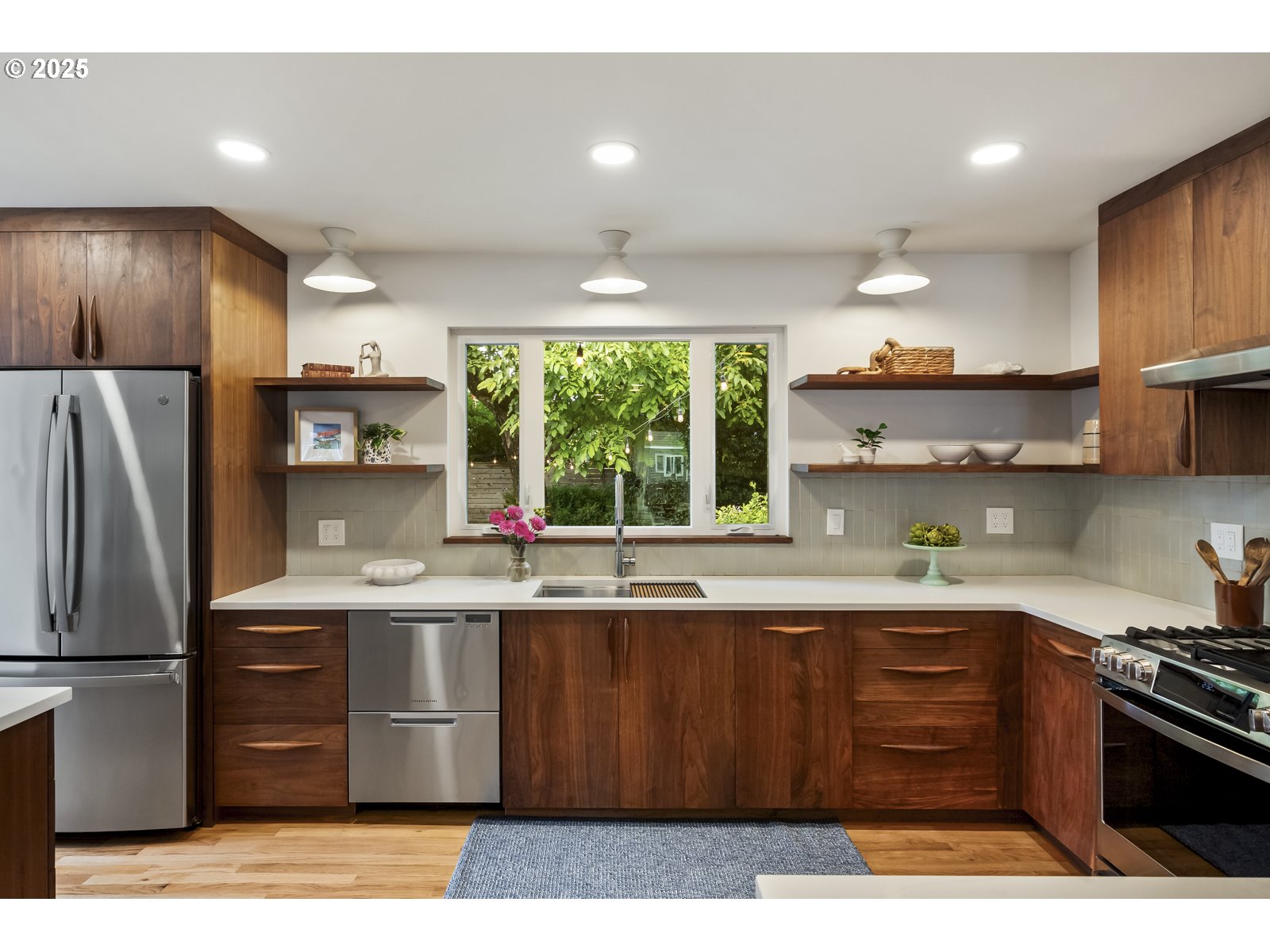 - Welcome home to this charming ranch in the heart of Woodstock. Blending original character with thoughtful modern updates, the main floor features a light-filled living room, a gorgeous cook's kitchen with counter seating, a dining area, and a breakfast nook overlooking the serene backyard. Three bedrooms and one stylish bathroom provide comfort for everyday living. The lower level recreation area, bar and wood-burning fireplace add warmth & character. Situated on a generous oversized lot, enjoy a large fenced yard under tree canopy, easy-care landscaping, and a hard-scape patio perfect for entertaining. Thoughtful updates include a new electrical panel, HVAC, AC, roof, gutters, soffits and siding, fence and patio! See the updates list for a complete timeline. Located in a walkable, bike-friendly neighborhood, schools, shopping, and restaurants. Dialed and move-in ready—this home delivers comfort and convenience with all the right updates. [Home Energy Score = 4. HES Report at https://rpt.greenbuildingregistry.com/hes/OR10019573]