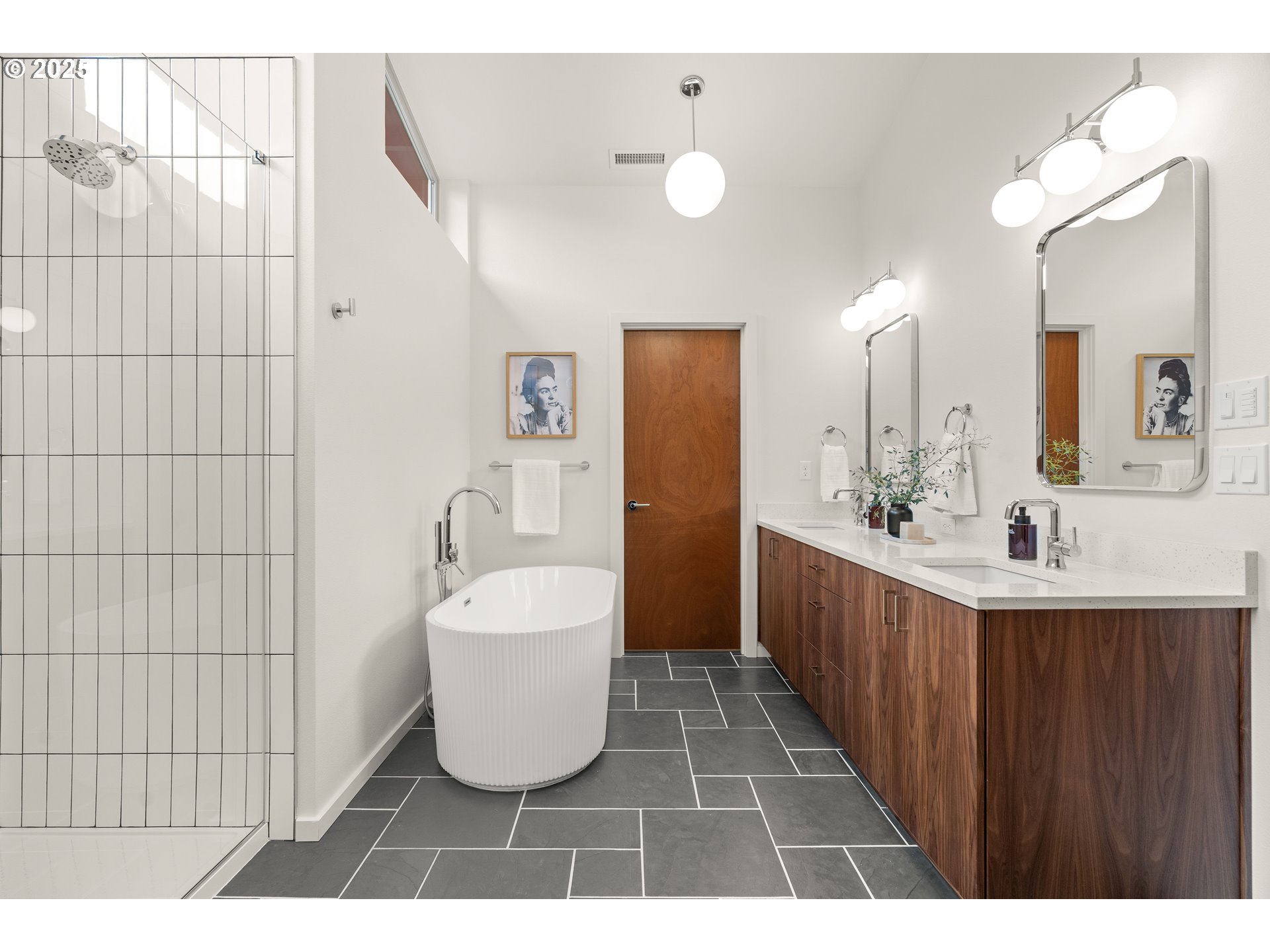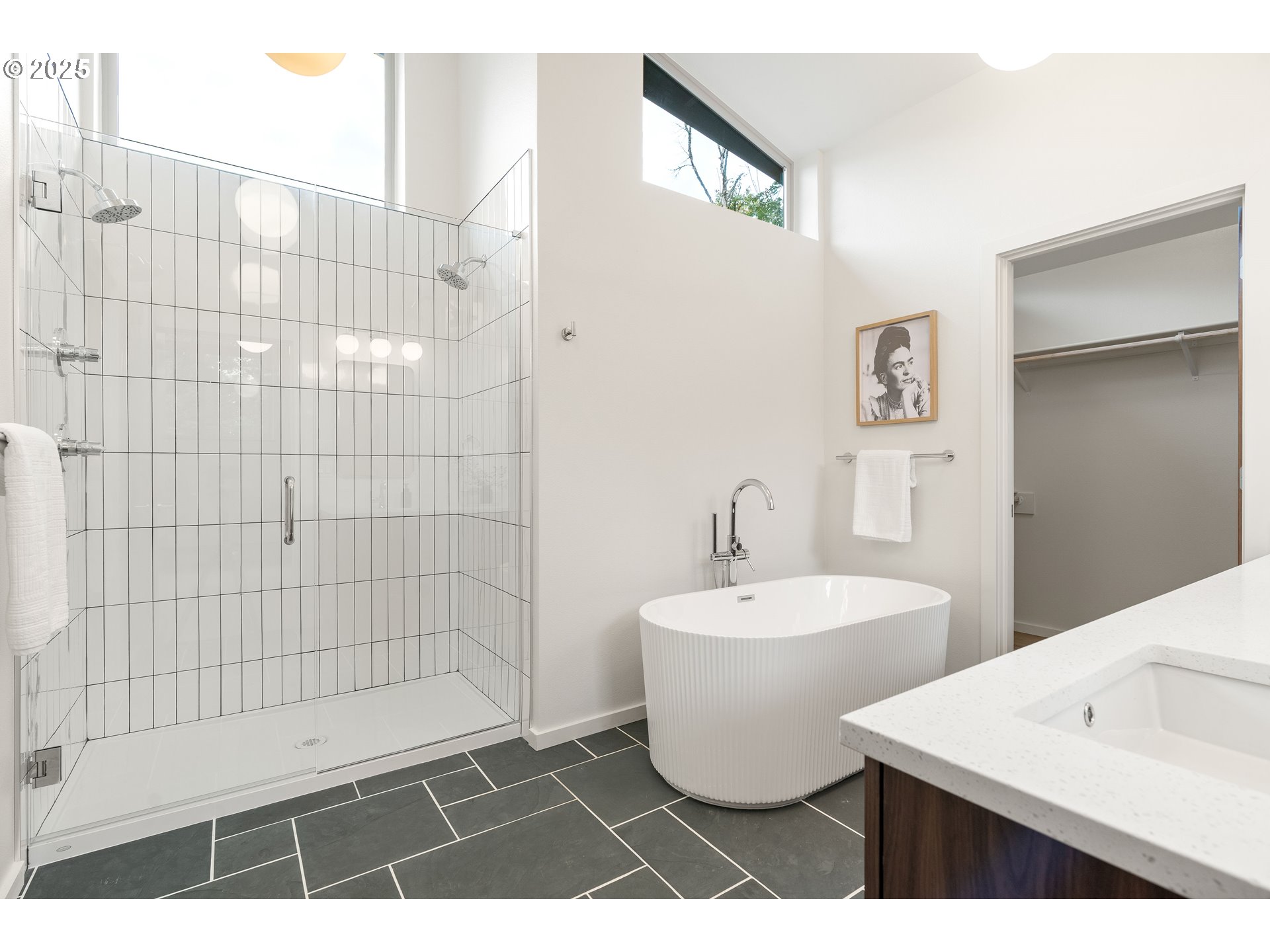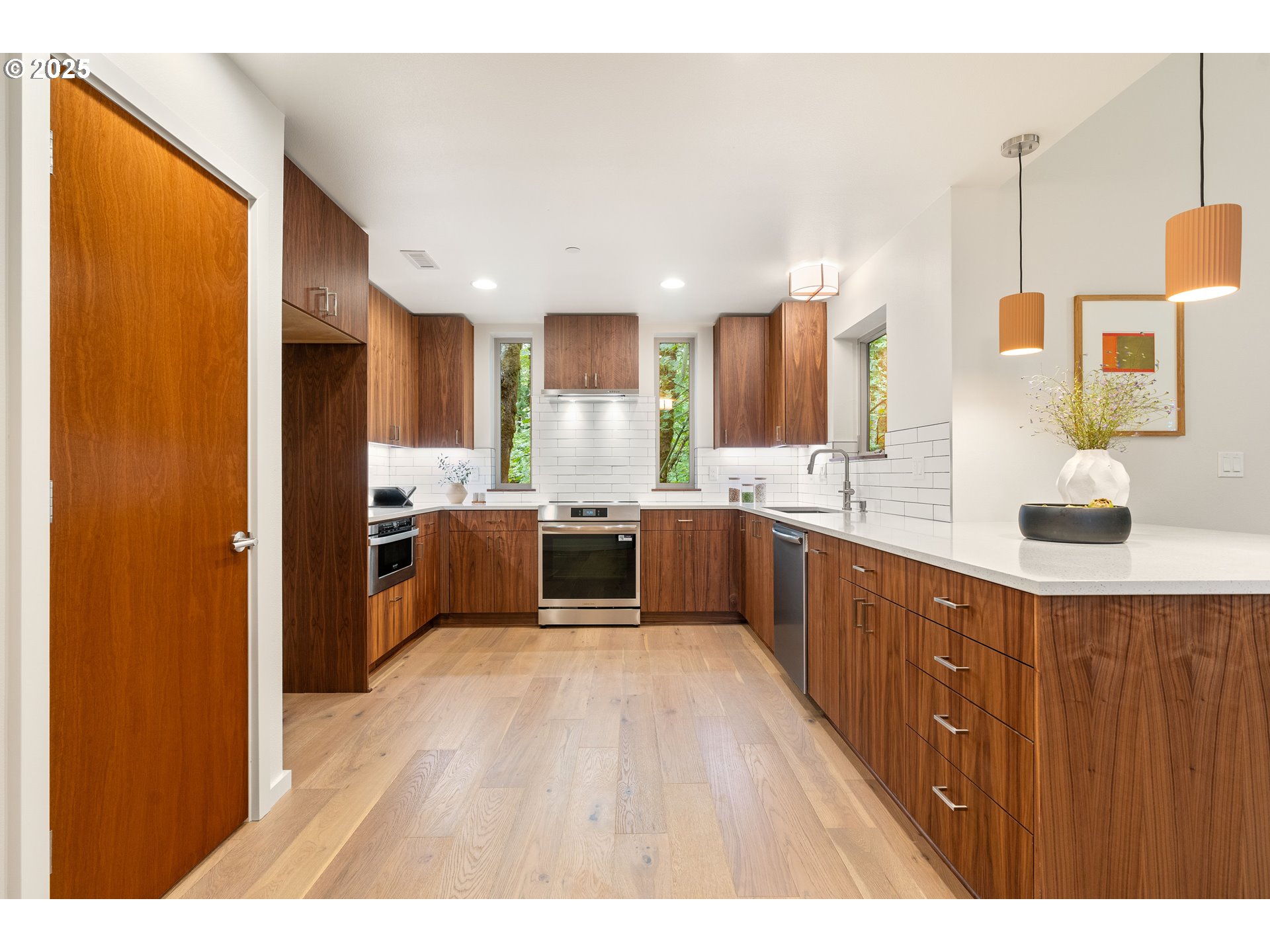 - Modern house in the forest - this brand new NW Modern home was thoughtfully designed for modern day living with details and fixtures influenced by mid century design. Enjoy the added benefit of the energy-efficient upgrades including the high efficiency heating/cooling systems, high level of insulation, high performance windows and an independent heat recovery ventilation system. The main level greets you with a large living room featuring vaulted ceilings,and a wall of windows flooding the interior space with natural light. The open airy living room provides a seamless transition between the adjacent dining room and kitchen. The kitchen features beautiful custom cabinetry, quartz countertops, designer lighting and tile. Sliding glass doors open the dining/great room to an exterior deck overlooking the lush forested green space, covered by a beautiful overhang that allows you to enjoy and relax in the outdoors year round. Wide plank oak hardwood flooring runs throughout the main level with a laundry room, bedroom and a half bathroom. The upper level features a vaulted primary suite with a large walk-in closet and ensuite bath with soaking tub, slate floors and designer details. One additional bedroom, a full bath plus a large bonus landing area for an additional lounging space. The daylight lower level features views of the adjacent forest, two bedrooms and a full bath. A large double car garage is attached on the main level with off street driveway parking. This home is located at the end of a private cul-de-sac, built into its site that borders a tranquil dedicated green space. Surround yourself with nature and beautiful design while being just minutes to St. Vincent, Nike, Intel, and downtown Portland. Close to local shops, restaurants and hiking trails. [Home Energy Score = 9. HES Report at https://rpt.greenbuildingregistry.com/hes/OR10242250]