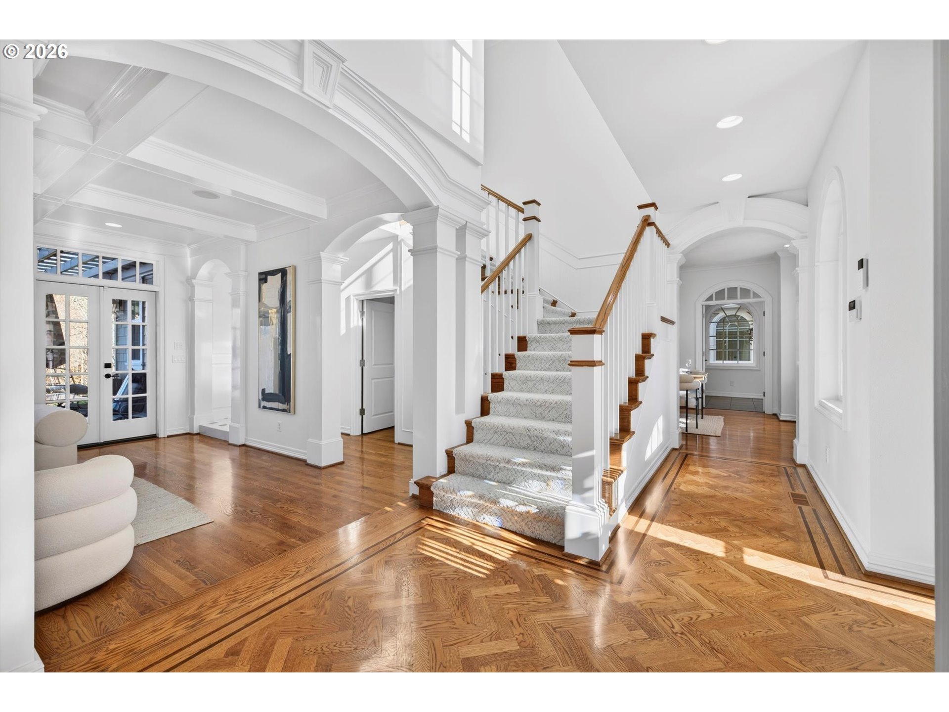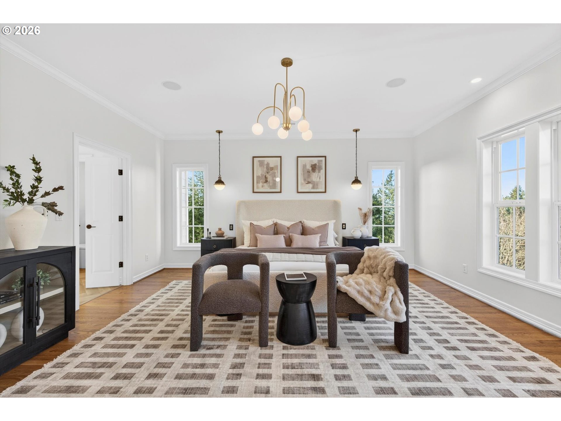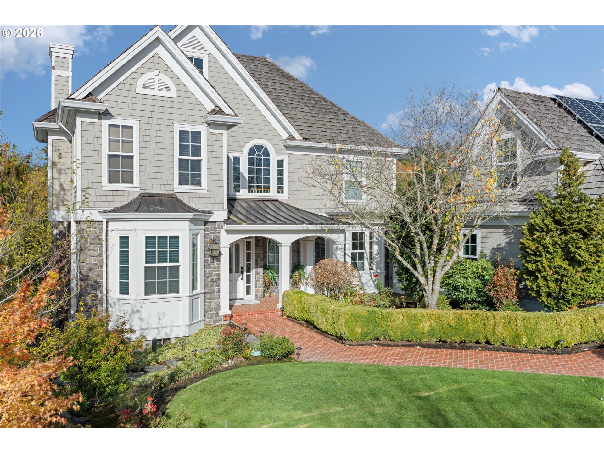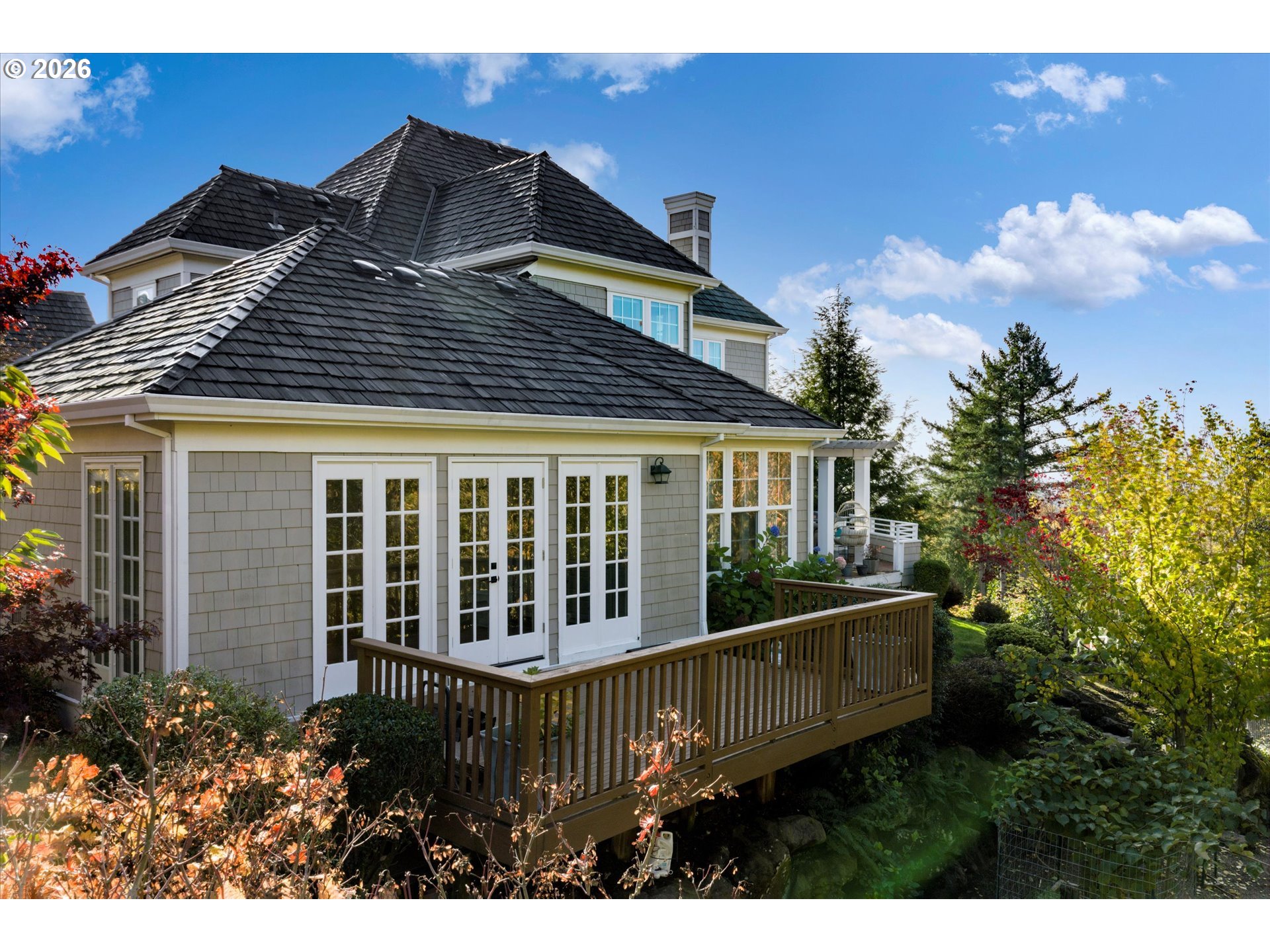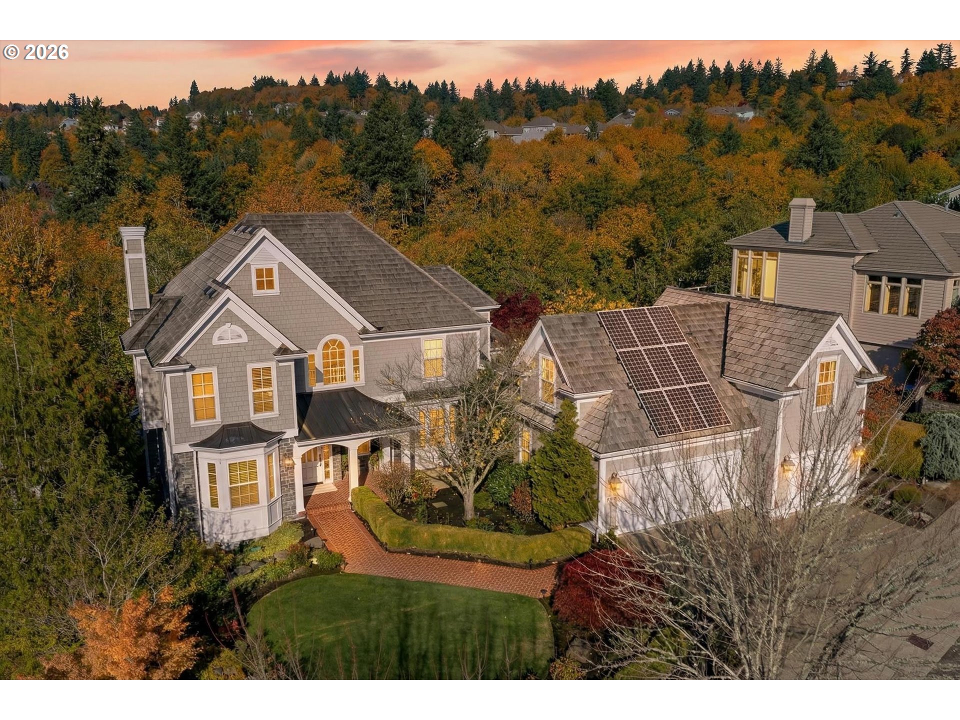 - Step into luxury in this stunning Forest Heights traditional, ideally situated in the coveted Skyline Summit with territorial views, breathtaking sunsets, and serene greenspace backdrop. This five-bedroom, four-and-a-half-bath residence blends timeless elegance with thoughtful functionality, offering refined architectural details such as box beam ceilings, gleaming oak floors throughout the main and upper levels, and a built-in speaker system. Formal living and dining rooms provide classic entertaining spaces, while the home also features a main-level guest suite with full bath and an additional bedroom above the garage—ideal for multigenerational living or private guest quarters. A media room, gym, and flexible bonus spaces offer endless lifestyle possibilities.The upper-level primary suite is a true retreat, complete with a walk-in closet, additional double closet, and a high-end remodeled bath featuring a custom tile shower and cabinetry, designer lighting, and a cozy reading nook. Designed for quintessential indoor-outdoor living, the home opens through French doors from both the living and family rooms onto two expansive decks—perfect for entertaining or enjoying peaceful moments surrounded by nature. Set on a private .3-acre lot, this exceptional property offers rare privacy while remaining just moments from Forest Heights Shopping Center, local coffee, dining, and grocery options. Zoned for Forest Park Elementary and Lincoln High School, this is a rare opportunity to own a sophisticated, view-oriented home in one of Northwest Portland’s most desirable neighborhoods.
