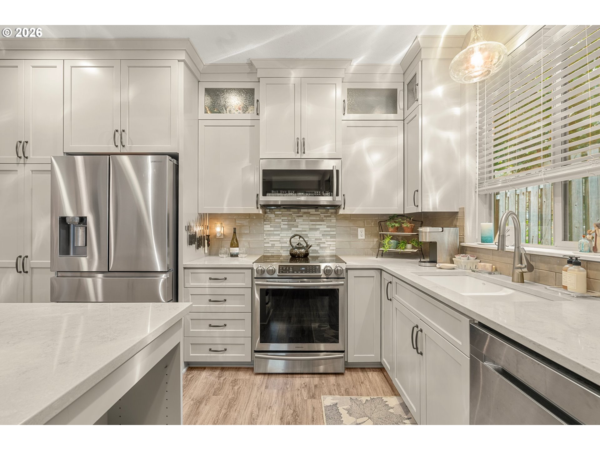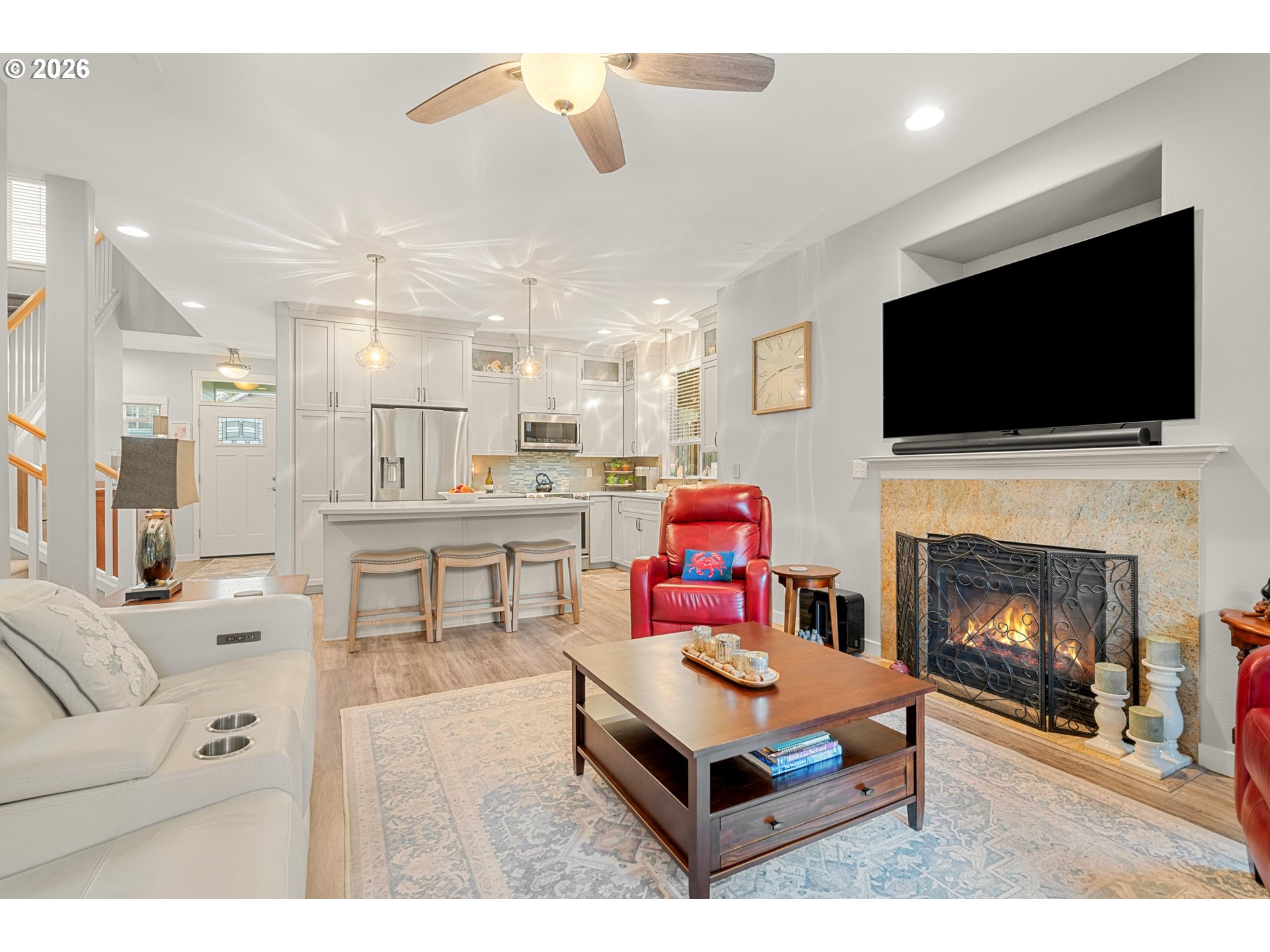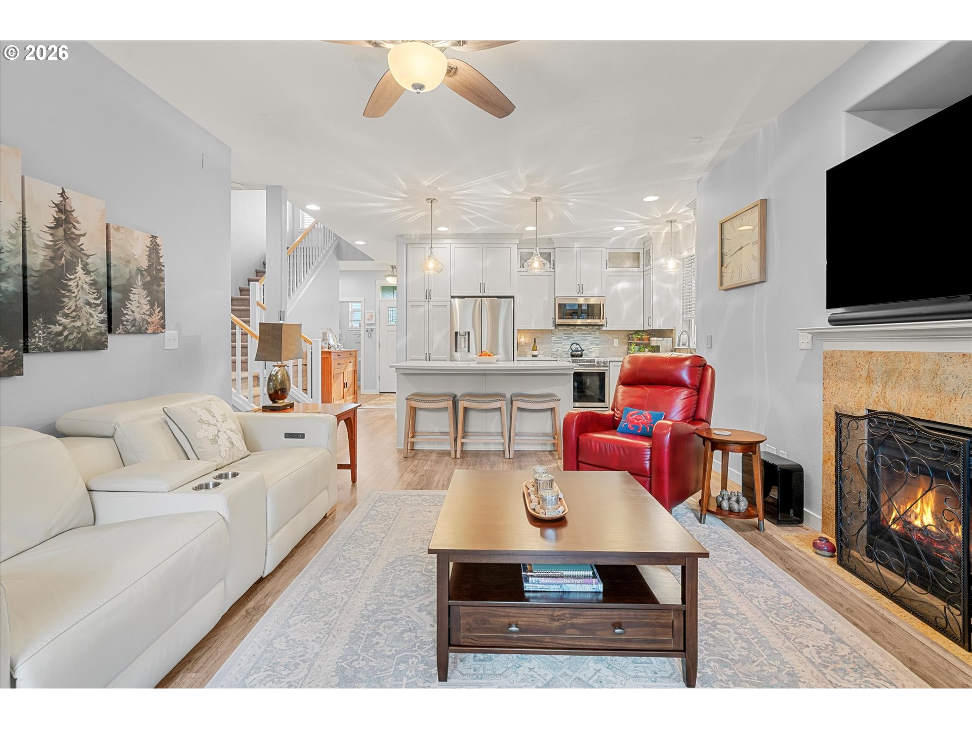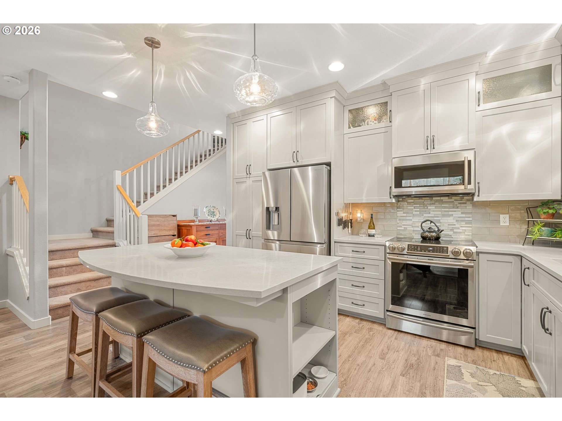 - This thoughtfully designed and carefully maintained home offers a highly desirable layout with an open concept style between the beautifully updated kitchen and cozy living room with gas fireplace. The primary suite has vaulted ceilings, big windows, a ceiling fan and easily fits a king-sized bed, nightstands and multiple large dressers. French doors lead to the primary bathroom with newer plumbing and fixtures, double vanities, jacuzzi tub, stand alone shower, walk in closet and a separate water closet. The main floor of the house which has newer engineered hardwood flooring and newer paint throughout is made complete with a formal dining room, laundry room with washer and dryer included in the sale and an extra deep coat closet. Upstairs you will find a loft space with tons of natural light, perfect for your home office or a reading nook leading to two generously sized bedrooms, each with their own closet, vanity and sink. Connecting the two rooms is a Jack and Jill bathroom with a shower tub combo. Multiple linen closets provide ample storage opportunities. Recent kitchen remodel included custom cabinets with pull out drawers, quartz countertops and island with counter height eating bar, tasteful fixtures and hardware and newer stainless steel kitchen appliances, all included in sale. Outside you will find a private, fenced backyard with gardenlike setting, automatic sprinklers, newer Trex deck, a covered front porch, a newer single-layer composition roof, newer gutters, newer exterior paint in neutral tones, updated furnace and AC as well as a newer water heater providing fantastic bones and systems for it's new owners. Low monthly HOA fees includes all landscaping for front and back yards as well as the water bill. This detached condo is just under 2000 total square feet and is located minutes away from grocery and retail shopping, restaurants, major bus lines, Clackamas Town Center, local schools and Hawthorne Neighborhood Park. Open 1/31 & 2/1 from 1-3pm!