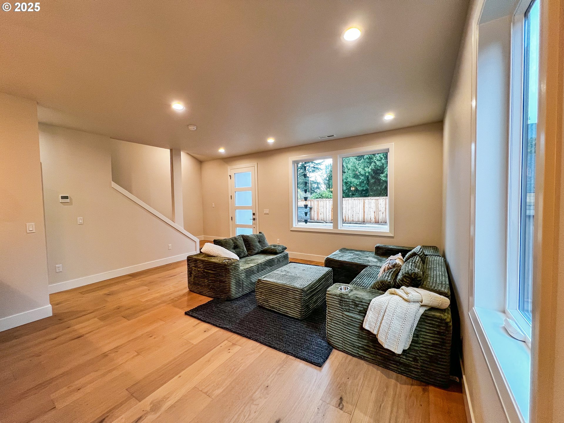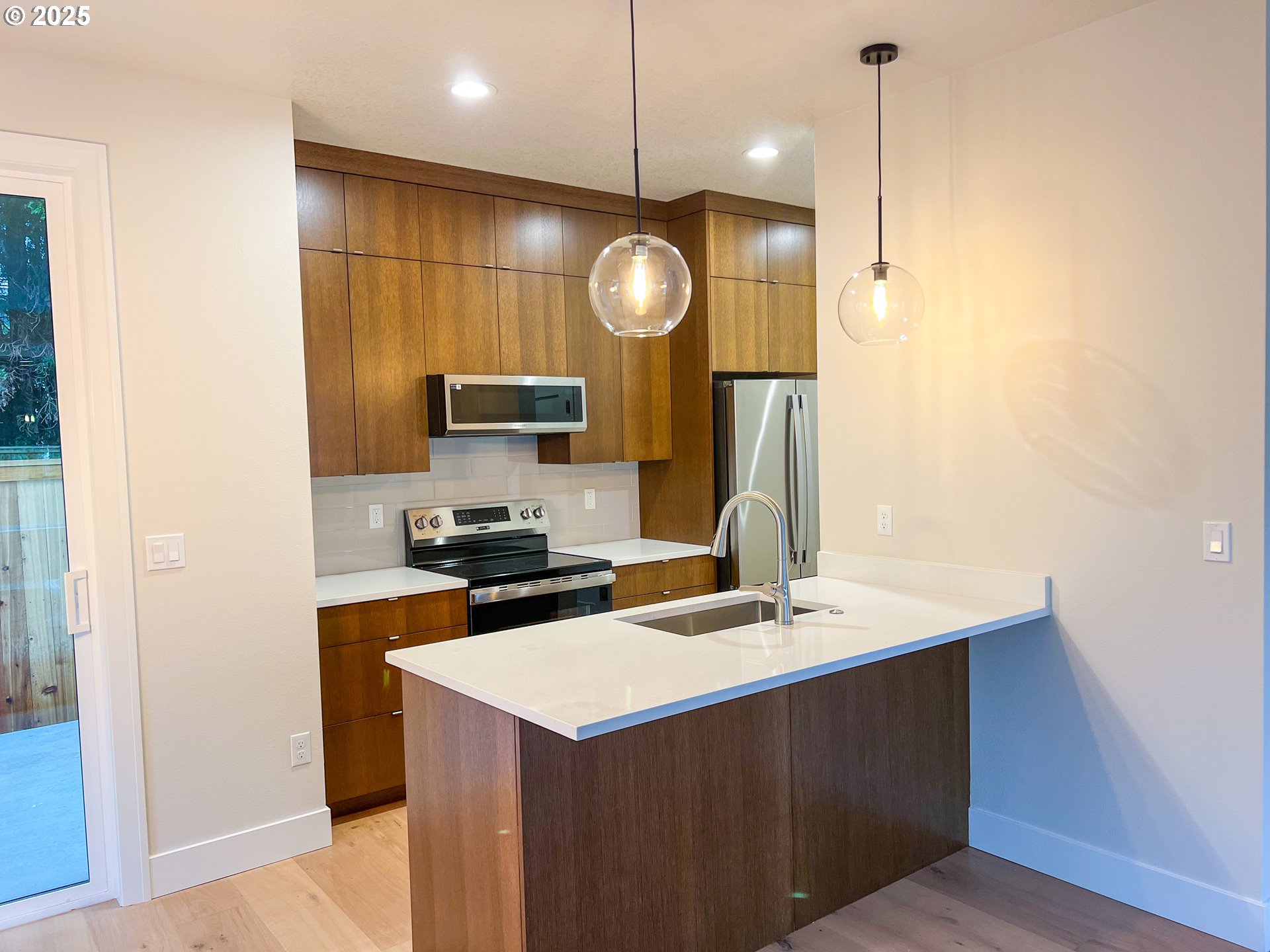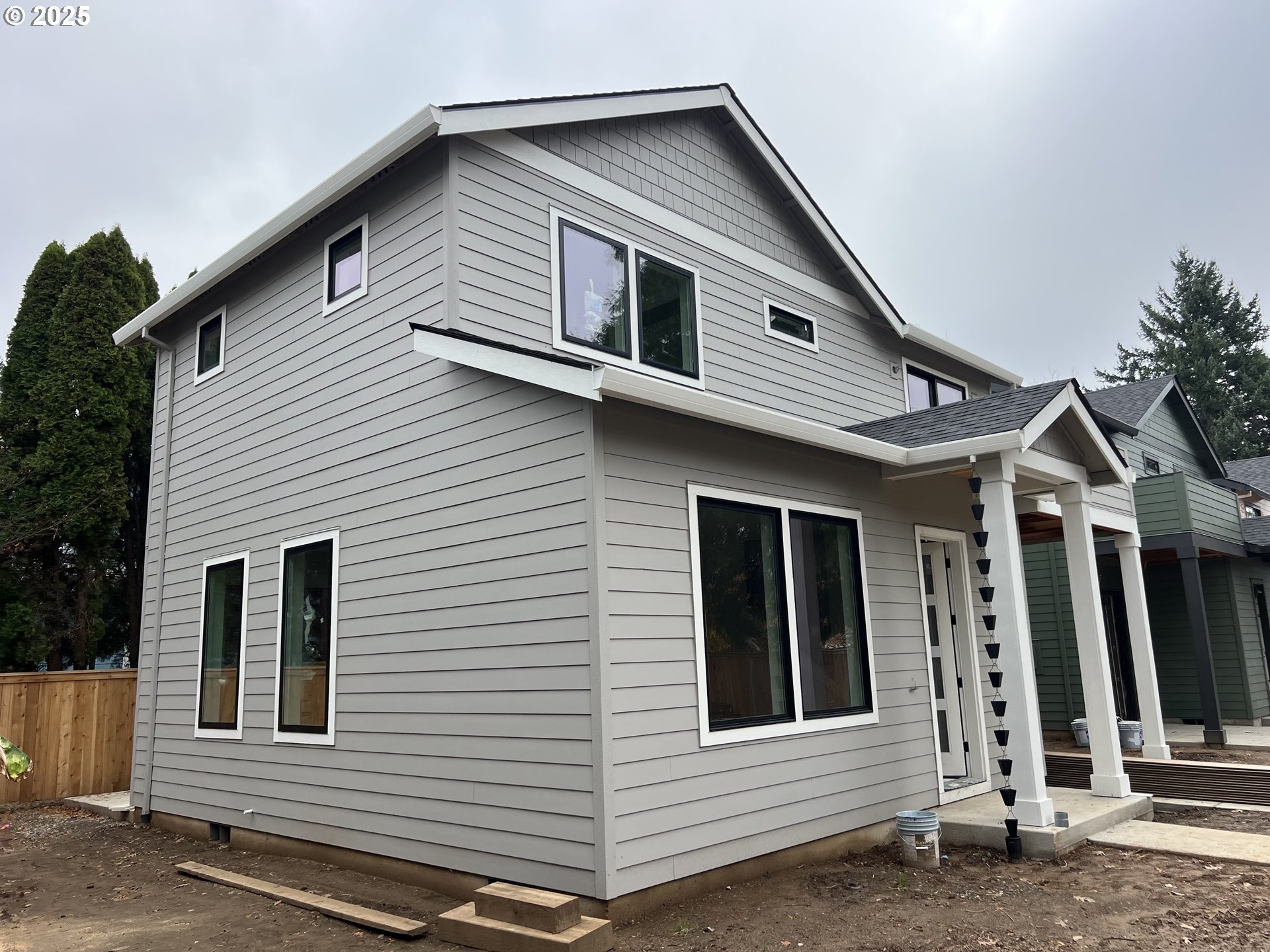 - This 2025 constructed home welcomes you with soaring 9-foot ceilings and an open-concept main floor that flows effortlessly from the living area to the dining space and contemporary kitchen. The kitchen showcases dark oak veneer cabinetry with soft-close drawers, elegant quartz countertops, and modern finishes throughout. A convenient half bath on the main level enhances both comfort and functionality, making this home ideal for everyday living and effortless entertaining. Upstairs, there are three bedrooms and two full baths. The primary suite features a walk-in closet, en suite bath with tile floor and private deck. Laundry is thoughtfully placed upstairs for everyday ease, while two additional bedrooms offer space for family, guests, or a home office. Every detail has been chosen with care: Engineered hardwood flooring, heated tile floors upstairs, window casings, trim throughout, sound insulation in interior walls, ring doorbell and a fully insulated garage with textured sheetrock. With a walk score of 67, enjoy hiking, shopping, and dining just minutes away, with quick access to I-205. Whether you’re starting fresh or searching for your forever low-maintenance home, this modern floor plan with high quality upgrades is a true showstopper.