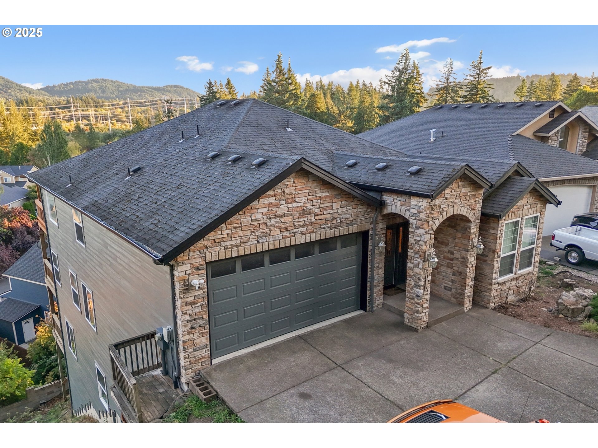 - Experience breathtaking mountain and valley views from this stunning 4,643 sq ft custom-built home. Thoughtfully designed across three spacious levels, this residence features a daylight basement with 1,191 sq ft of additional living space—perfect for guests, entertainment, or multi-generational living. Enjoy seamless indoor-outdoor living with a private patio on every level, each offering a peaceful retreat to take in the natural beauty that surrounds you. Inside, the home showcases high-end finishes, including all stainless steel appliances, granite countertops, custom cabinetry, and striking stone accents throughout the main living areas. The spacious living room is centered around a cozy gas fireplace, creating a warm and inviting atmosphere year-round. A rare blend of craftsmanship, comfort, and scenery—this home is truly one of a kind.