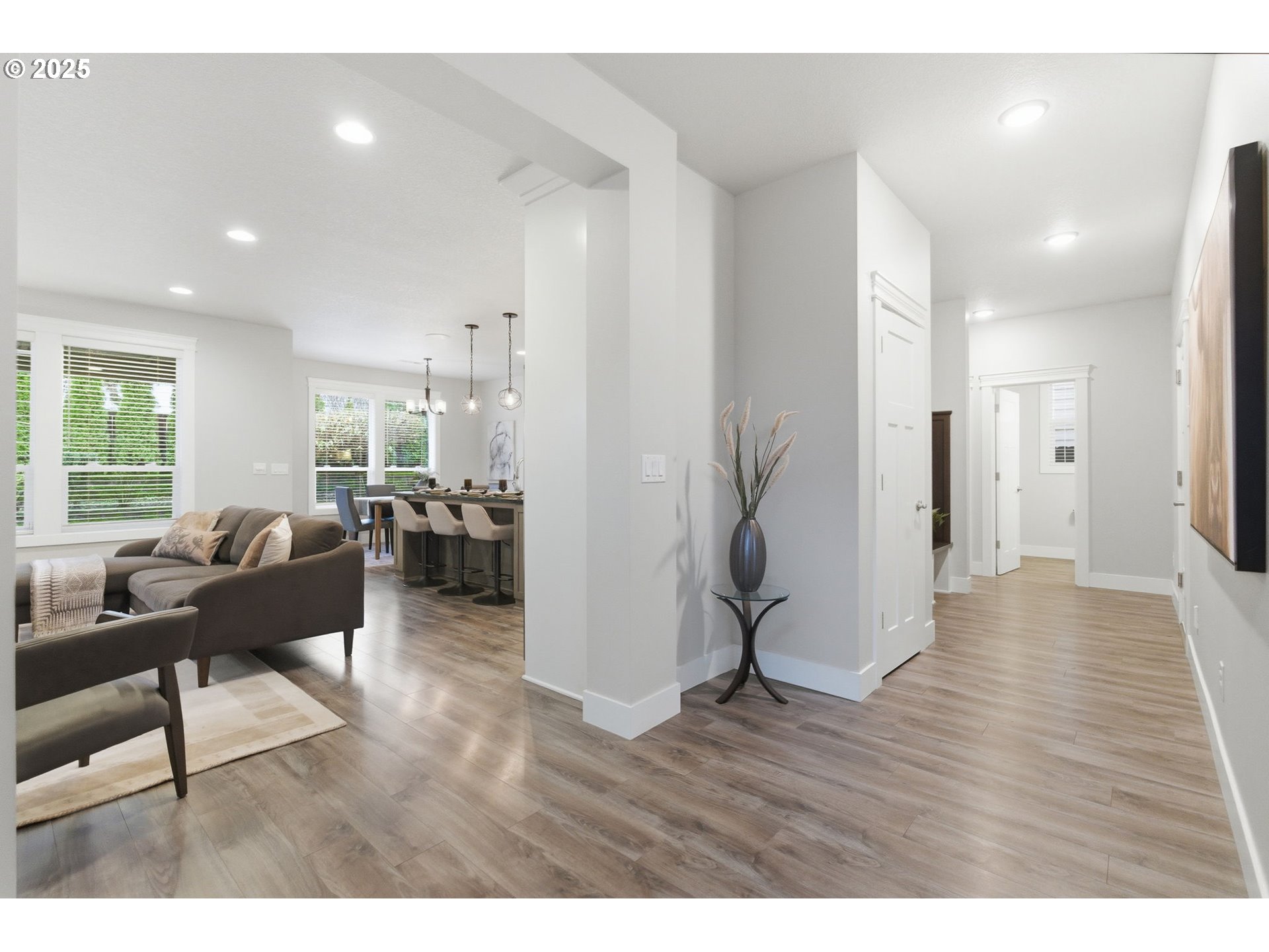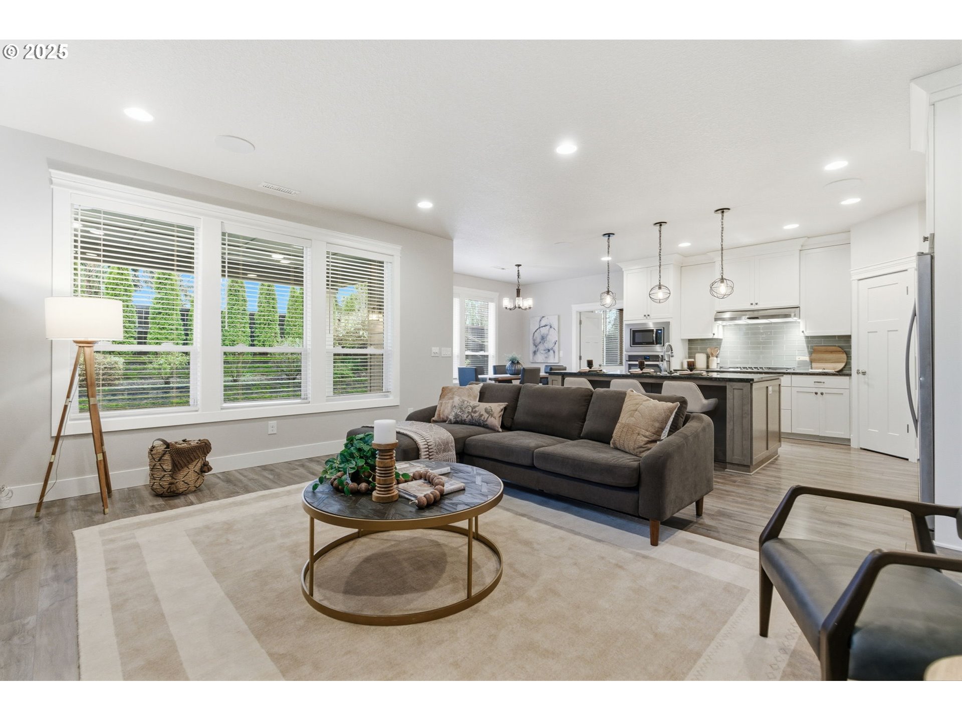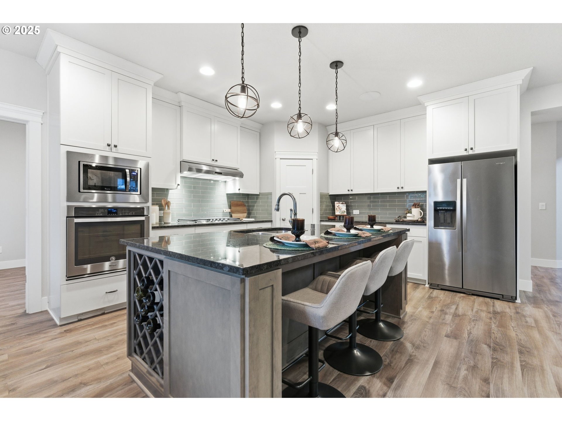 - Thoughtfully designed and exceptionally maintained, this newer construction home blends everyday comfort with refined style in a desirable Ridgefield neighborhood known for its convenience and community feel. The main level features LVP flooring, a stone-wrapped gas fireplace with custom built-ins, and a spacious kitchen appointed with quartz counters, stainless steel appliances, gas cooktop with hood, tile backsplash, walk-in pantry, and a large eat-in island complete with a wine rack. A dining nook overlooks the backyard, while a versatile main-floor bedroom/office/den and a convenient pass-through hallway with bench and cubbies add function to the layout.Upstairs, the primary suite offers a relaxing sitting area, soaking tub, walk-in shower, and an oversized walk-in closet. Three additional bedrooms on the upper level provide generous space and flexibility.Outside, the landscaped and fenced backyard is set up for year-round enjoyment with a covered entertaining area, built-in speakers, and a ceiling fan. A three-car garage, air conditioning, and all included appliances complete the package.