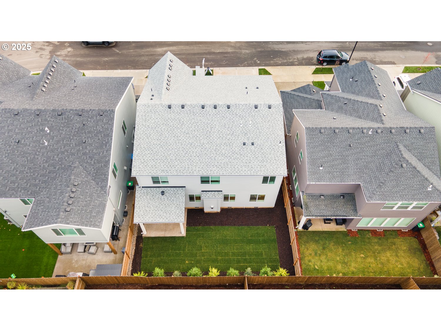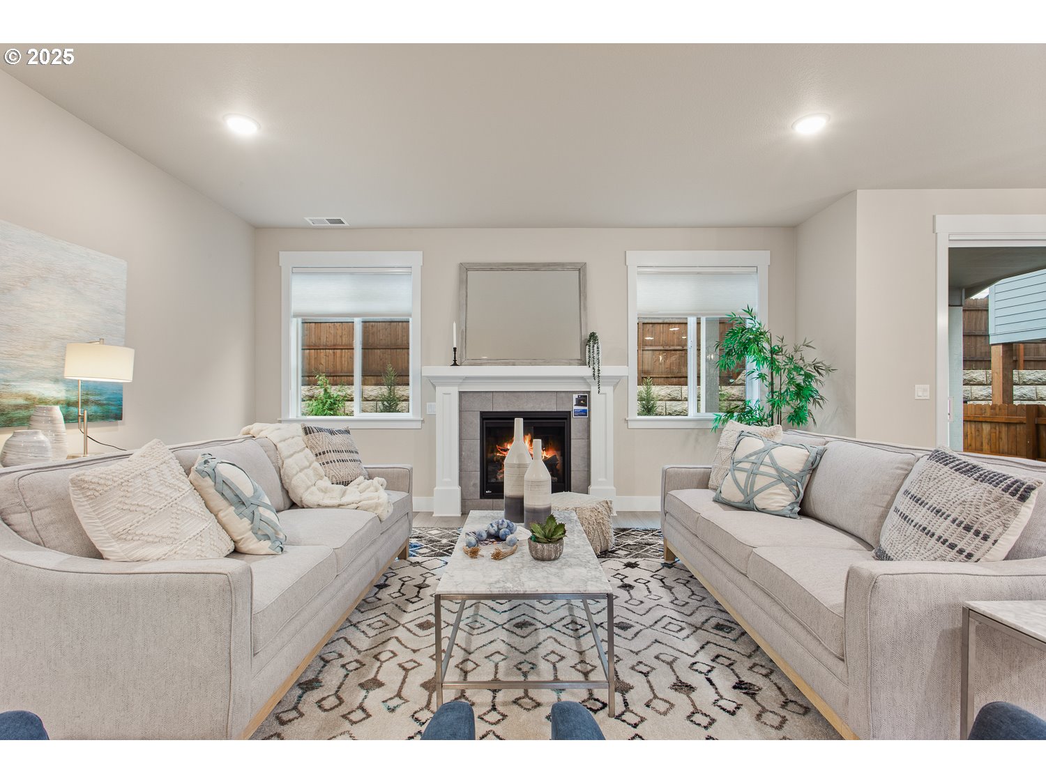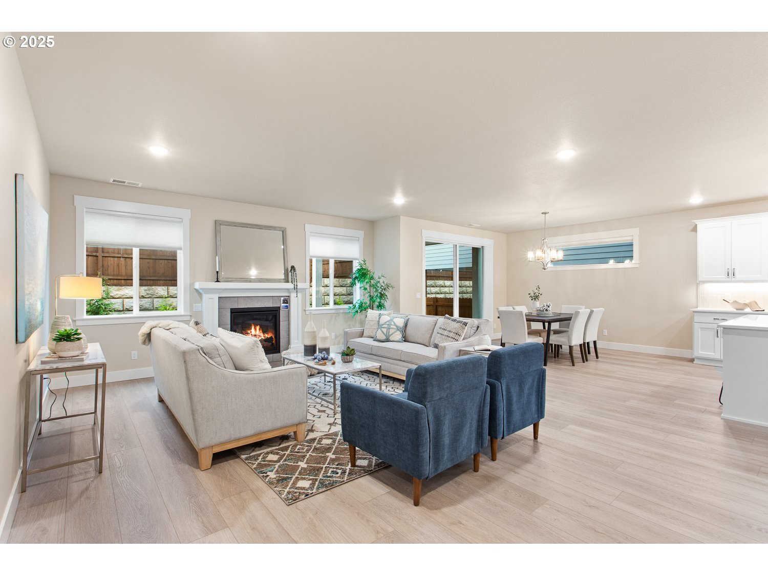 This beautifully upgraded home features a bedroom and full bath on the main level, along with a spacious den off entryway. Drop Bevel style painted cabinetry, slab quartz countertops, and undermount sinks in kitchen and baths. Forno stainless steel appliances, including a Forno 6 gas burner cooktop, microwave w/convection, wall oven, dishwasher, and a 1200 CFM hood vent. The open-concept layout flows into a roomy great room with a gas fireplace and painted mantle. A generous primary suite with coffered ceiling adjoins a luxurious primary bath with dual sink vanity, garden tub, a 5'x4' all tile shower and large walk-in closet. Enjoy central air conditioning controlled by a Nest thermostat, along with a tankless water heater for energy-efficient, on-demand hot water. Outside, a 12' x 12' covered patio with a gas line hookup is perfect for year-round BBQs. The landscaped front and back yard include a timer-controlled sprinkler system, and the rear yard is fenced with a gate for added privacy and security. Earth Advantage Certified! Builder incentive available!