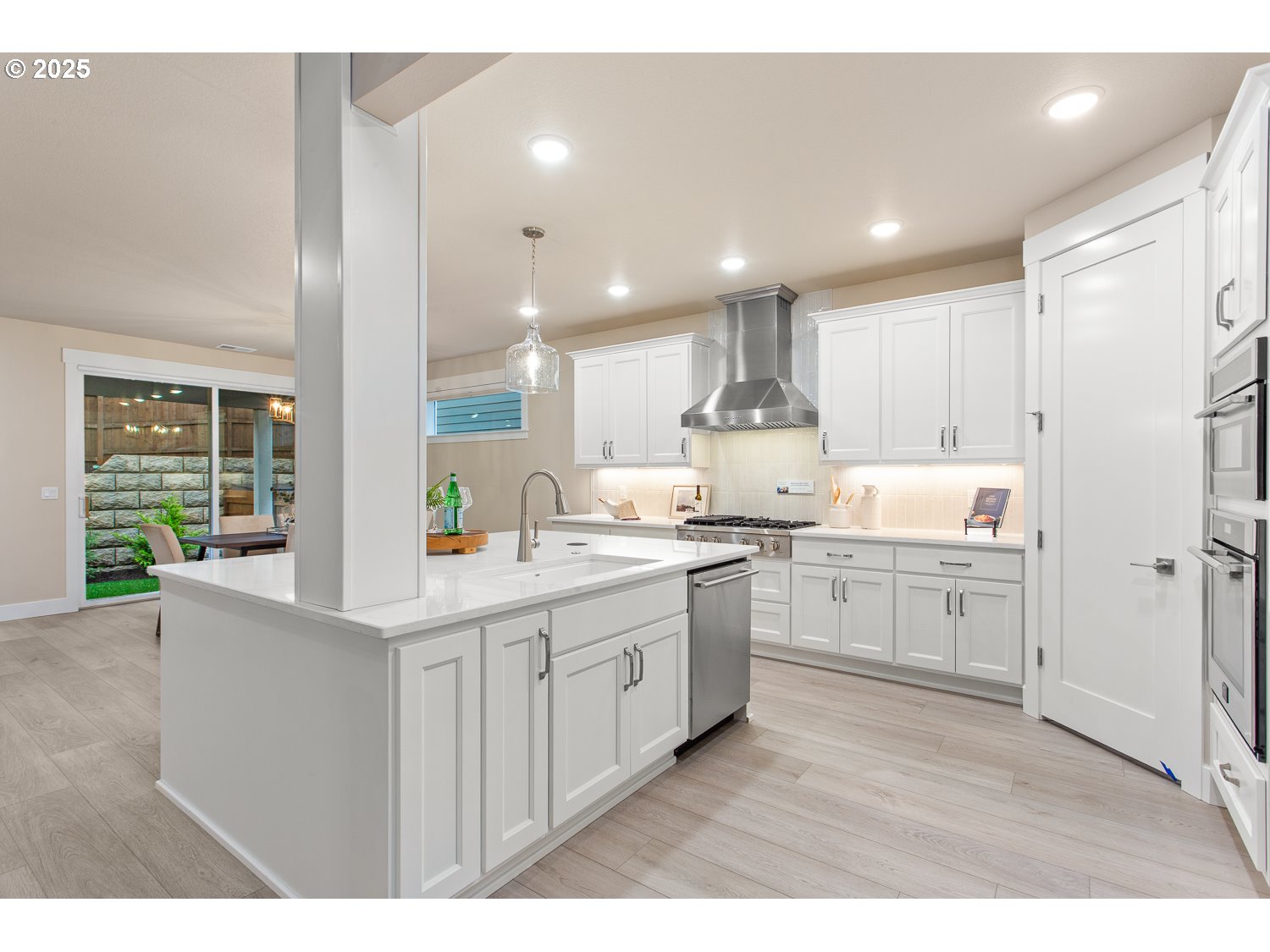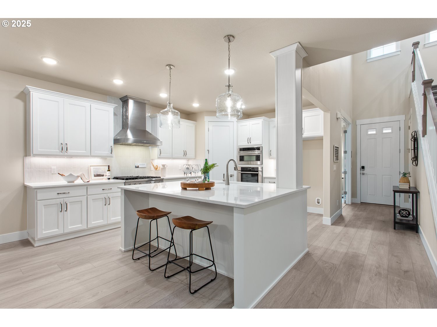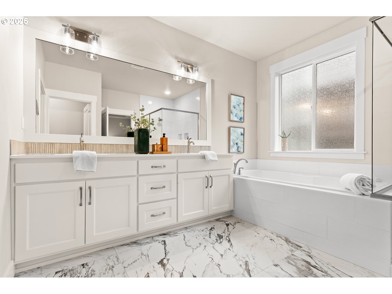 This beautifully upgraded home features a bedroom and full bath on the main level, along with a spacious den off entryway. Drop Bevel style painted cabinetry, slab quartz countertops, and undermount sinks in kitchen and baths. Forno stainless steel appliances, including a Forno 6 gas burner cooktop, microwave w/convection, wall oven, dishwasher, and a 1200 CFM hood vent. The open-concept layout flows into a roomy great room with a gas fireplace and painted mantle. A generous primary suite with coffered ceiling adjoins a luxurious primary bath with dual sink vanity, garden tub, a 5'x4' all tile shower and large walk-in closet. Enjoy central air conditioning controlled by a Nest thermostat, along with a tankless water heater for energy-efficient, on-demand hot water. Outside, a 12' x 12' covered patio with a gas line hookup is perfect for year-round BBQs. The landscaped front and back yard include a timer-controlled sprinkler system, and the rear yard is fenced with a gate for added privacy and security. Earth Advantage Certified! Builder incentive available!
